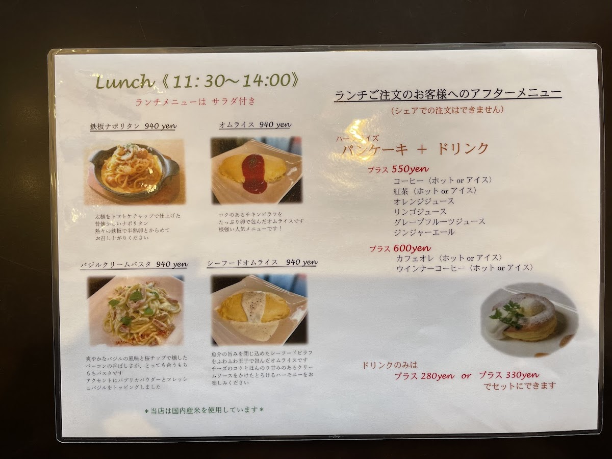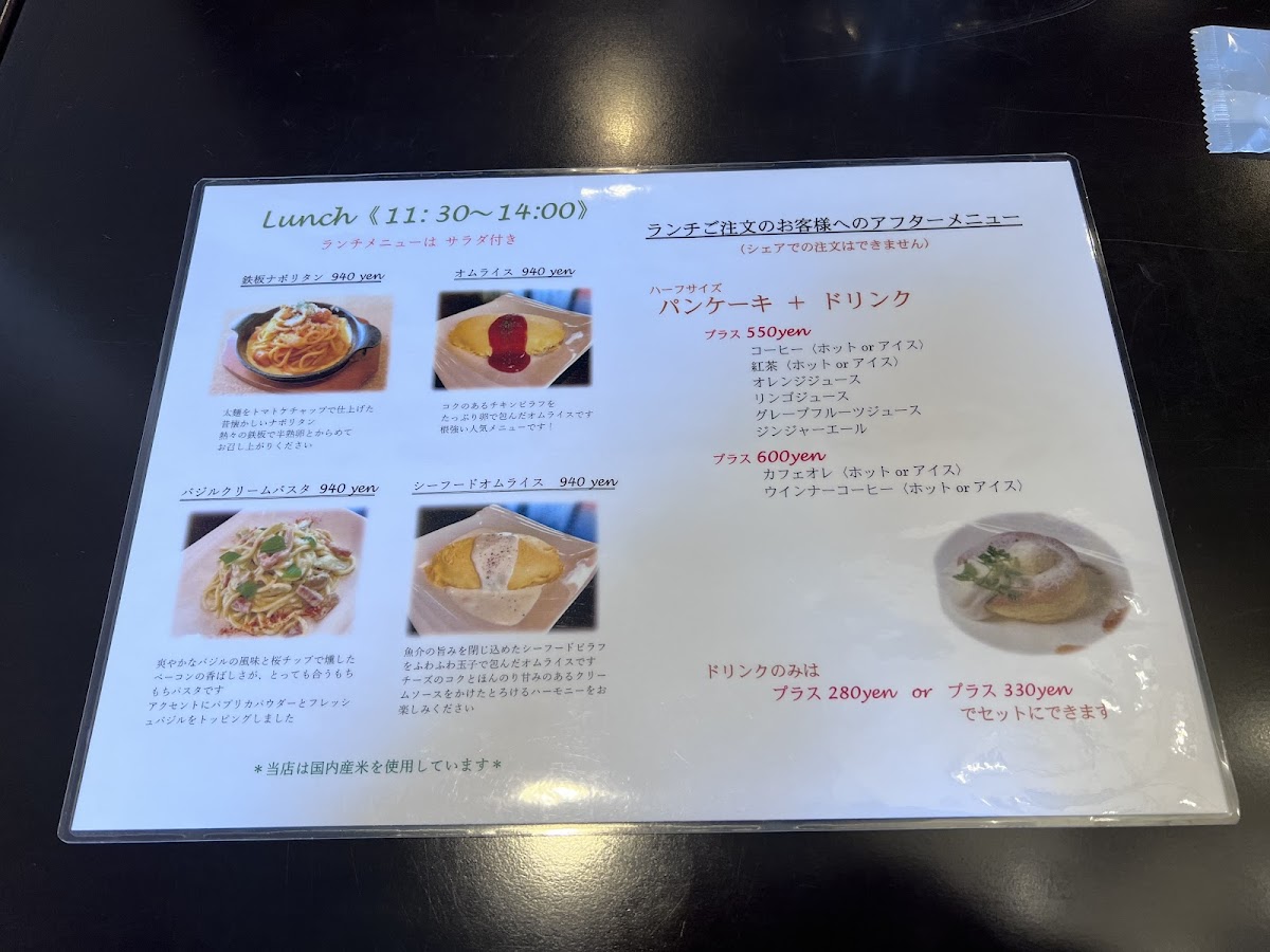 - Lunch Options: The lunch menu features four enticing selections, including creamy Napolitan pasta and two varieties of omurice. Each dish promises rich flavors that leave a lasting impression.